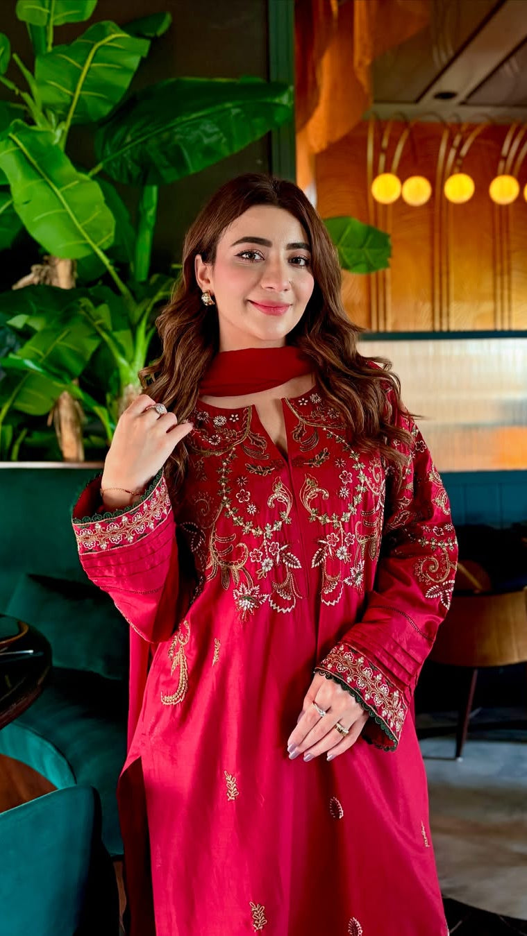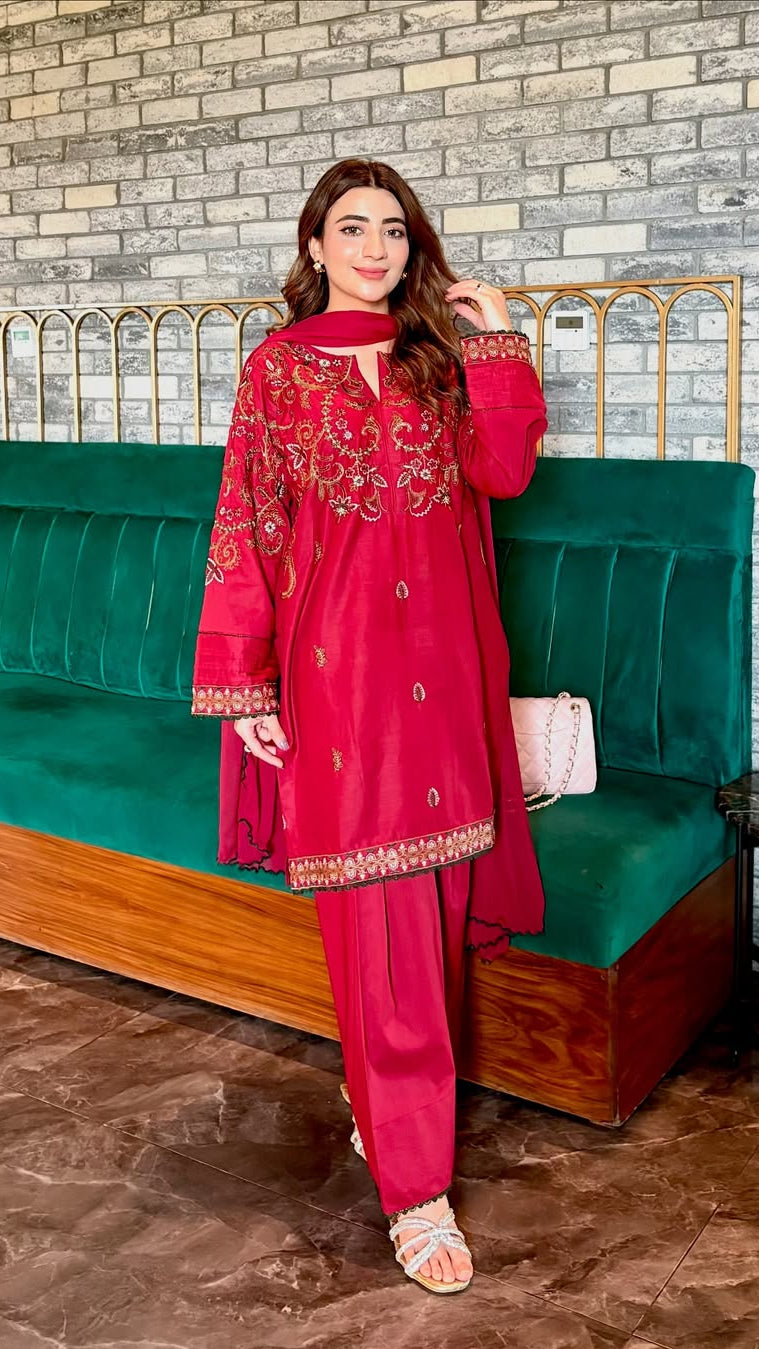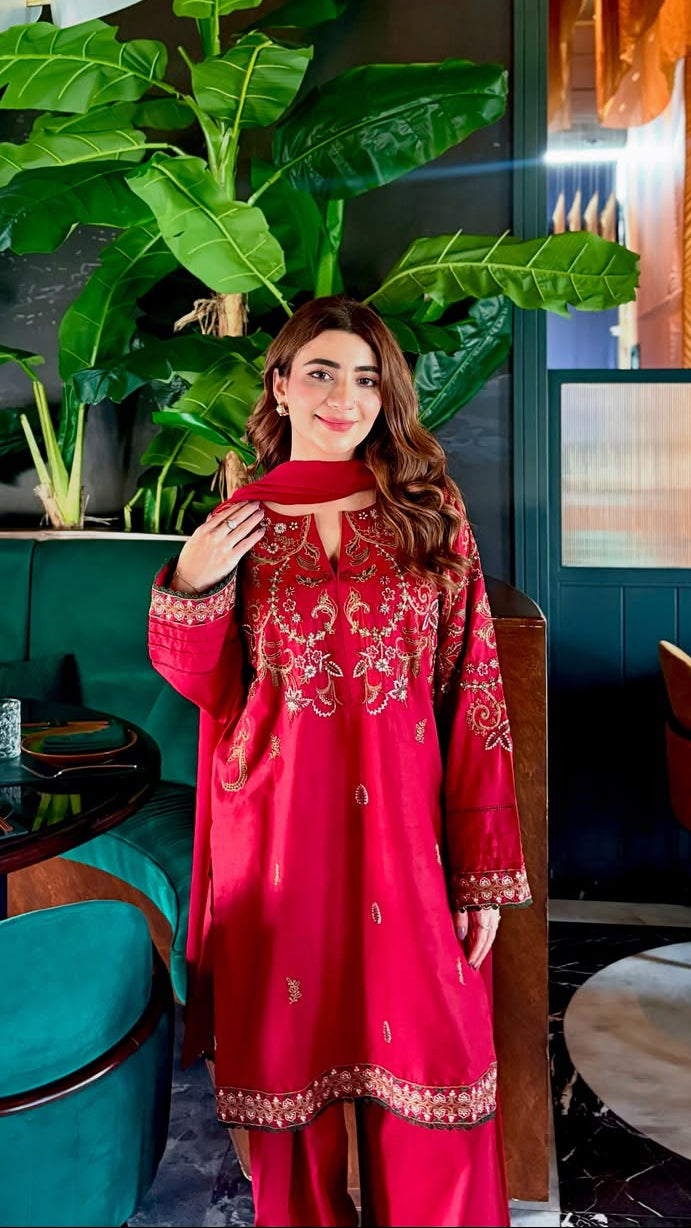 A deep red lawn outfit with intricate embroidery β lightweight, breathable, and perfect for summer soirΓ©es. Style, grace, and comfort wrapped in one effortlessly elegant look.