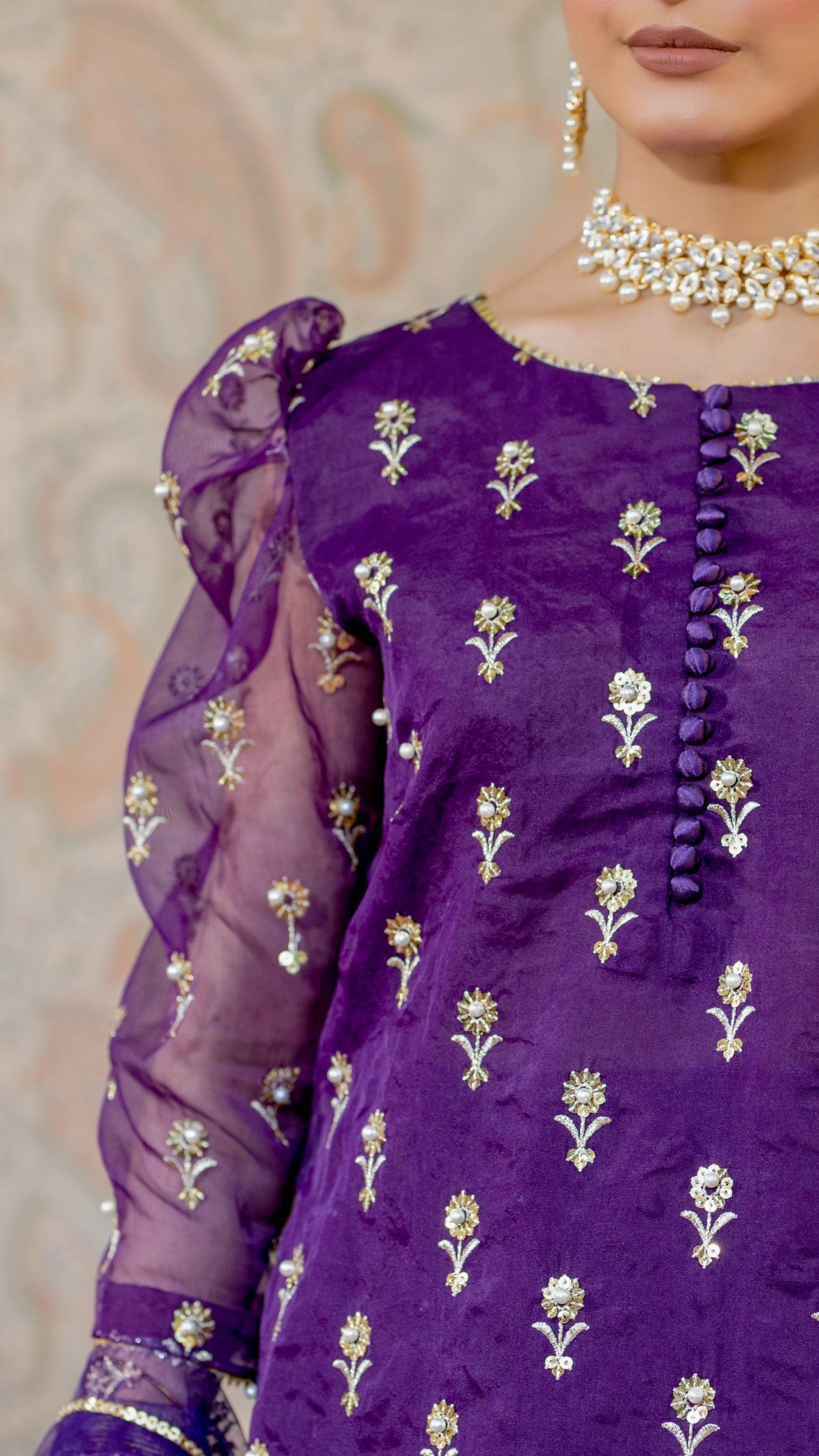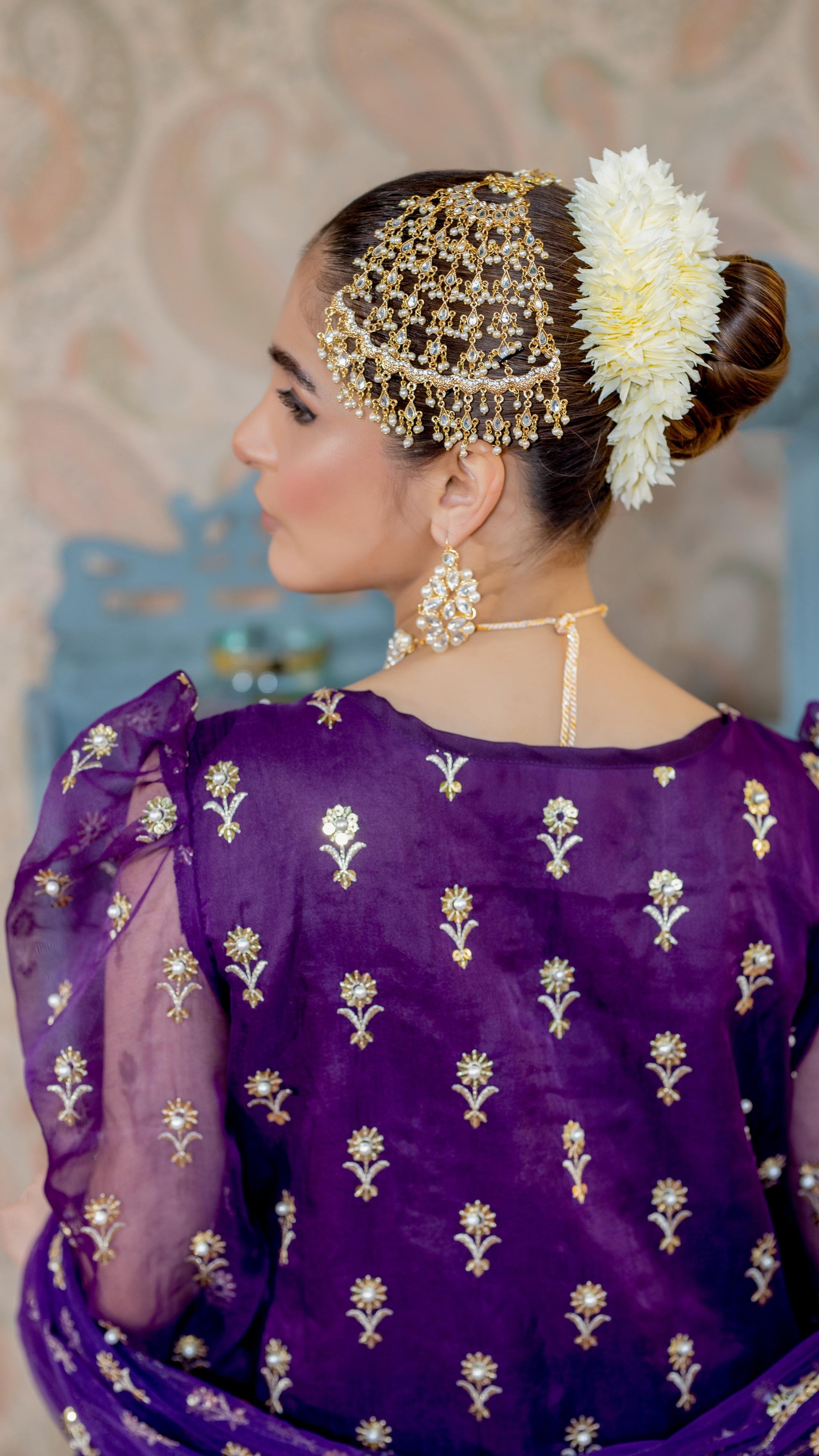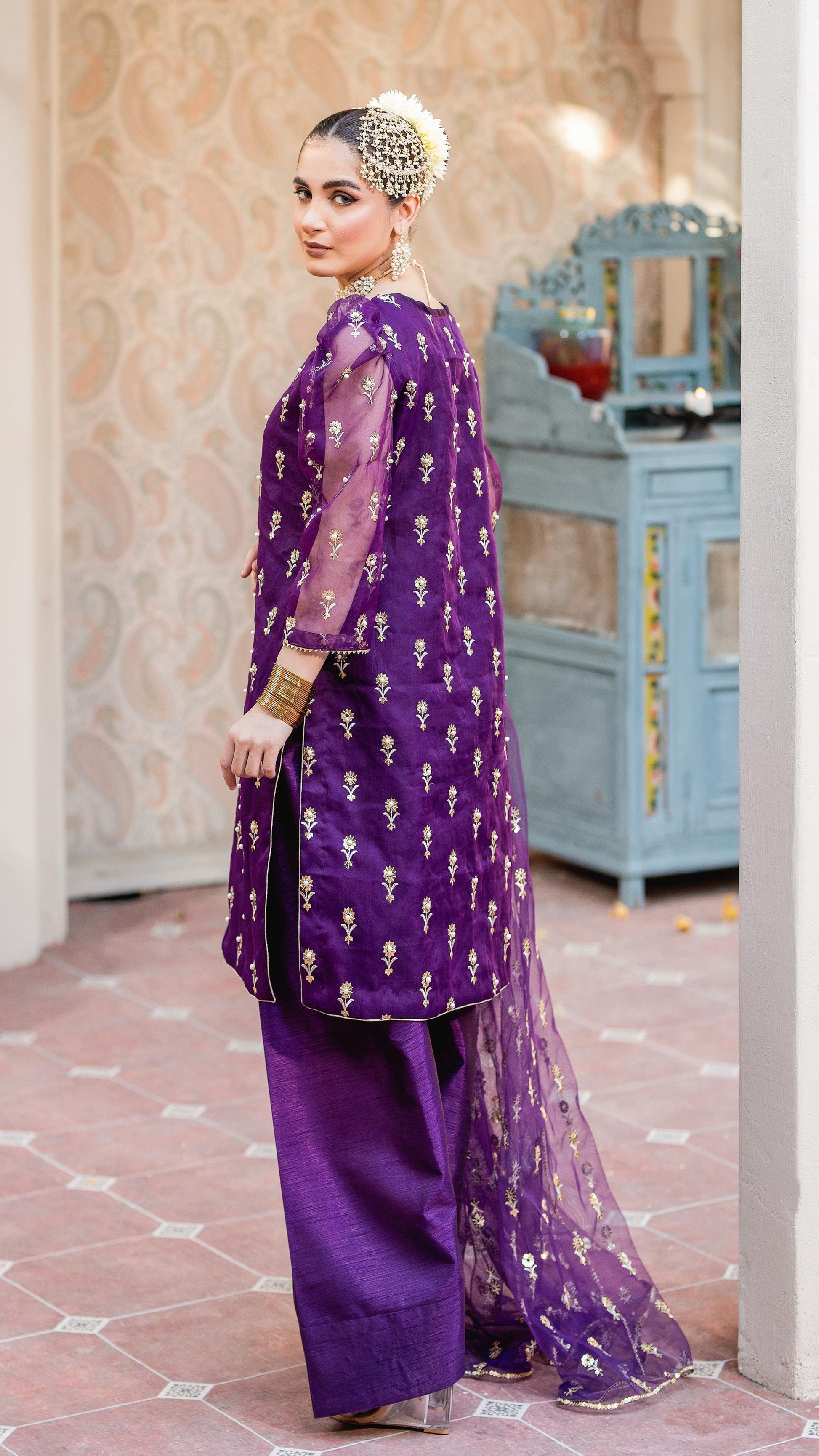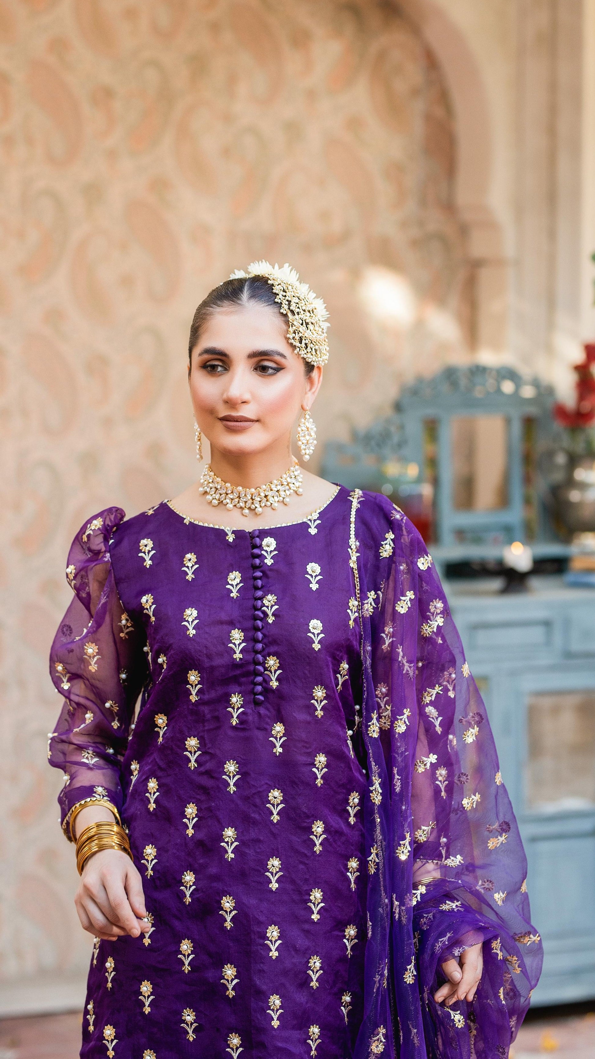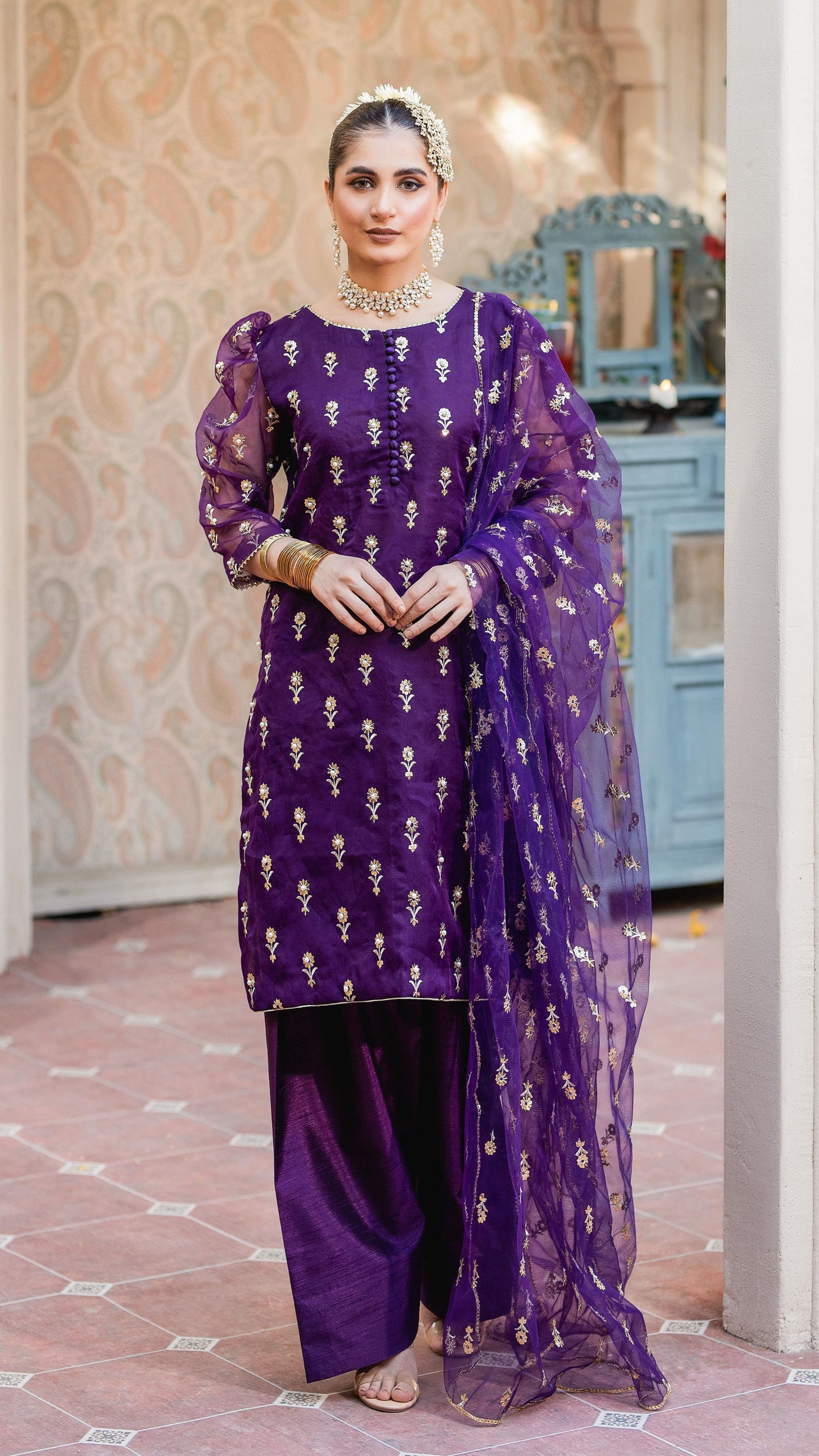 Description: Step into the world of classic sophistication with this exquisite deep purple kameez and Shalwar set, adorned with delicate gold embroidery. The puffed sleeves and flowing silhouette evoke traditional charm, while the shimmering motifs add a royal touch. Paired with a matching dupatta and complemented by luxurious jewelry, this outfit is perfect for festive occasions or cultural celebrations.